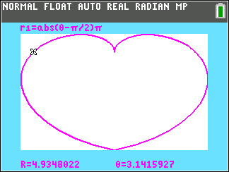 Now it’s time to get serious about love. To get started sharing your heart, press the y= key. In r1, input |θ- π/2|π. (Absolute can be found by pressing the math key then arrow to NUM.) Then, press the window key. Make sure θmin = - π/2 and θmax = 3π/2. Then, press the zoom key and either press 0 or arrow down to ZoomFIT. Talk about a passionate polar graph!