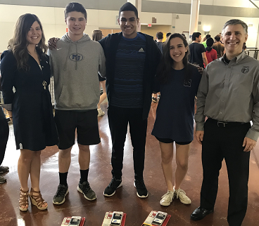 Katie Brown, Reagan High School teacher (left), pictured with students in her computer science class which won the Rover dance-off, along with Peter Balyta, president of TI Education Technology