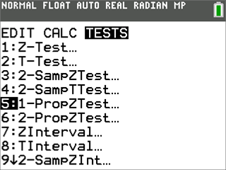 As sure as the sun will rise tomorrow, you will be asked to carry out an inference procedure on the free response portion of the exam. You may be given sample statistics to work with or perhaps a small data set to input. Either way, you must be sure to know which type of inferential procedure to do. Key words like “provide evidence” or “significant” are indications that you are being asked to test a pair of hypotheses. “Estimate” or “confidence” gives indication that an interval is appropriate to answer the question. Be sure to be familiar with each type of inferential procedure, including its outputs. Recall that the t-procedures are required when dealing with questions about a population mean or difference in two population means. Inference procedures for proportions are indicated by “Prop” in the title of the command on the calculator. A Chi-squared test for homogeneity has the same mathematics as a Chi-squared test for independence, so there is only one Chi-Squared test option for these tests. To located the TESTS menu, press the stat button then arrow right to TESTS.