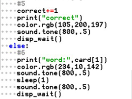 This new version is a short quiz. It asks students to enter the vocabulary word for a given definition and keeps track of the number of correct answers. If the answer is correct, play a tone and make the light on the TI-Innovator™ Hub teal. Otherwise, play a tone twice, and display a magenta light. The code might be as follows: #1. New project libraries.