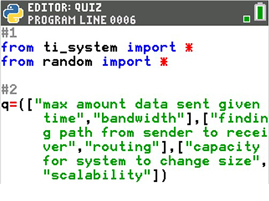 The list for computer systems and networks is rather lengthy. Think about all the review students could accomplish if each student in your class created a flash card stack with a different list of vocabulary. After a few days of practice, partner pairs could link calculators and swap vocabulary lists. Let’s take a look at how the code might look: (Note that #1, #2 and #3 are shown in the code itself as comments. These have been included for instructional purposes to help clarify the purpose of each section of code. These are not essential code elements to include.) #1. First, you need the library imports. #2. Then, question and answer lists.