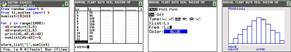 Python makes it easy to code simulation, then export the data to the TI-84 Plus CE Python system. · In only nine short lines, students can roll a pair of dice 50 times and store the sum. · The data is exported to L1 for use on the statplot and graph page.