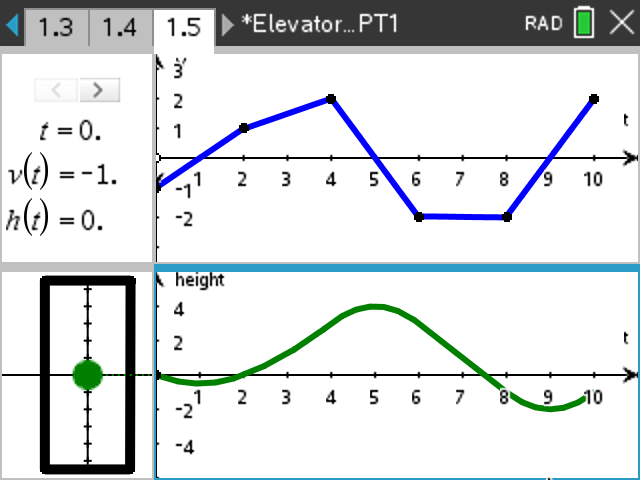 These TI-Nspire documents are based on the context of the rectilinear (straight line) vertical motion of an elevator. The motion of an elevator is a particularly nice context for introducing ideas related to rectilinear motion (position, velocity, speed, acceleration, etc.) because the connection to the vertical coordinate of related graphs is more natural and does not require the additional mental work of representing functions depicting horizontal motion (for example, of a car). The Elevator_Height_and_Velocity TI-Nspire documents allow the user to provide a height function h to “drive” the motion of an elevator. The document produces a corresponding velocity function by differentiating the given height position function. The height function drives the motion of the elevator as the user advances the value of time t via a slider.