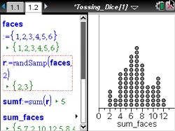 This lesson involves simulating tossing two fair dice, recording the sum of the faces, and creating a dotplot of the sums.