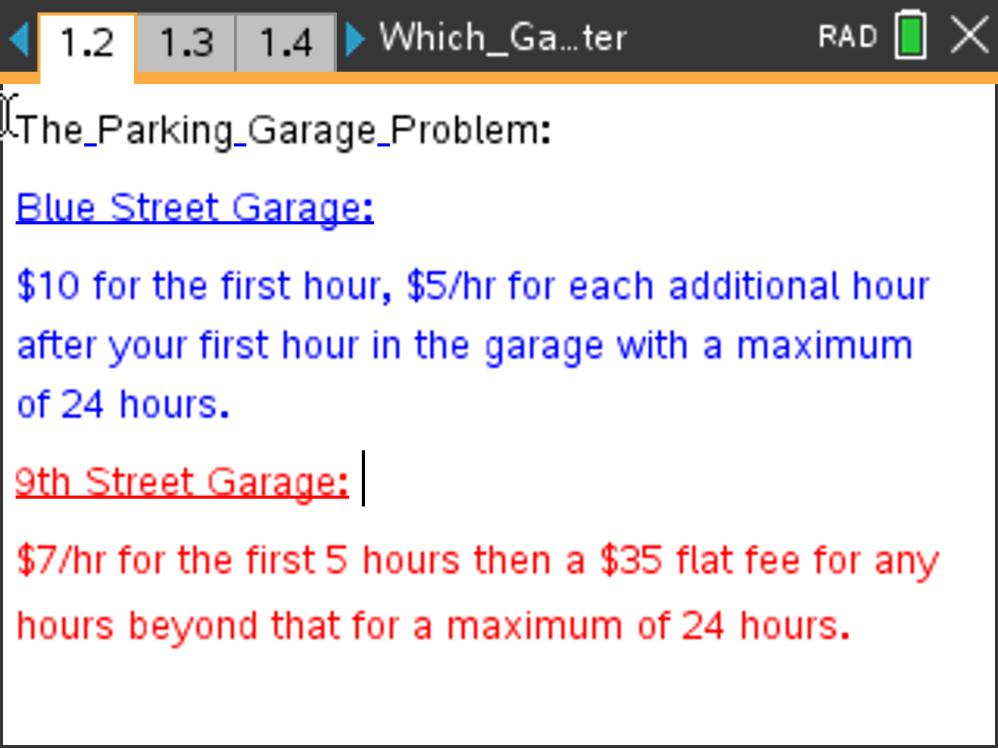 Students are to find the solution to a system of linear equations using technology. They are presented with a problem about parking lot fees.