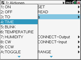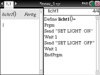 Für das Programmieren am Rechner werden wir den Programmeditor verwenden, der sich im menu des Calculators findet. Mit dem Send-Befehl werden Anweisungen zum TI-Innovator™ Hub geschickt, die eine physikalische Reaktion erzeugen (ein Licht leuchtet auf, ein Ton erklingt, ein Motor wird gestartet, etc.).