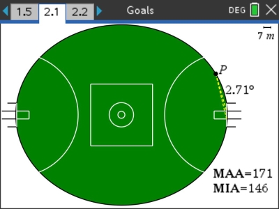 Students start by modelling shots on goal in soccer. The rectangular field shape combined with the specific shooting locations simplifies the mathematics. Once students have finished looking at soccer, they move onto the real situation one AFL player created after taking a mark near the point post. The player walked back along the boundary line, almost all the way to the 50m arc and proceeded to kick a goal! Was this the best place to kick a goal? Use differential calculus, arcTan and coordinate geometry to explore this practical problem.