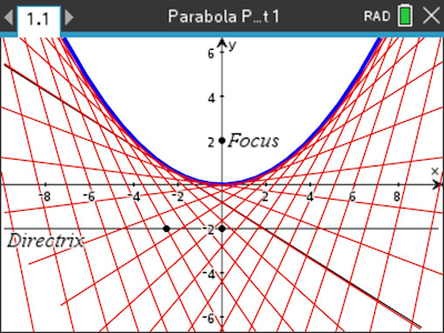 The paper folding component of this activity provides a simple way for all students to engage and see a parabola form. The calculator environment replicates the physical folds in a very dynamic way and provides a platform on which students can model the curve using a dynamic parabola. At this point the curve is being modelled. The next activity provides a simple proof of why this series of folds (envelope) is an actual parabola.
