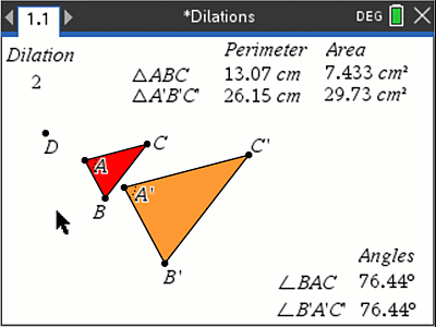 Students create shapes in the Geometry application and then dilate them using the corresponding transformation tool. Students are able to experiment, measure lengths, area and angles to see which elements change (variant) or which stay the same (invariant) through the transformation process.
