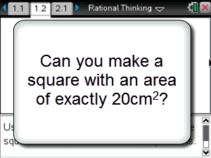 Students start with a square with integer side lengths and see that it is not possible to create a square with an area of 20 square cm. Spinners are attached to decimal places to progressively increase the accuracy, a better approximation results. A number line is used to improve accuracy with the ability to progressively zoom in for an even better approximation. The Babylonian technique is presented visually then numerically to find an even better approximation, leaving students to ponder “will we ever get there?”