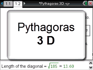 Students are provided with an activity file that includes an interactive diagram of a three dimensional box. Each side (edge) of the box can be varied with the subsequent diagonal length displayed. Students compute the length of the diagonal to verify Pythagoras’s theorem in three dimensions.