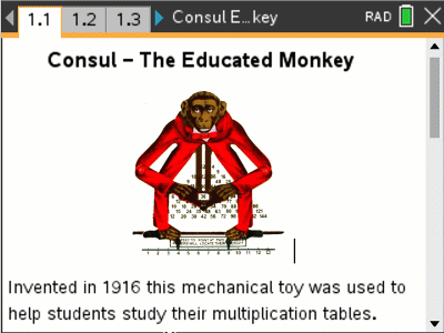 Consul the Educated Monkey was a toy built in 1916. The toy consisted of a series of mechanical linkages, relying on geometric properties to generate multiplication tables. In this activity students use a dynamic, virtual representation of the toy to explore these geometric properties and how they were used to construct multiplication tables. Students are also invited to consider other applications of this wonderful toy. The activity involves proof by similarity and congruence, including angle properties and is scaffolded via questions and interactive content.