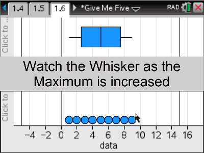 This activity explores the calculations of the five figure summary: {min, Q1, median, Q3 and max}. How is an outlier determined? What is positive / negative skew? By physically dragging the maximum point students can determine when the whisker ‘breaks’ and an outlier is created. The connection between the dot plot and the box and whisker plot improves the visual power of this dynamic interaction.