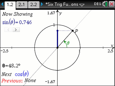 The six trigonometric functions sine, cosine, tangent, secant, cosecant and cotangent are represented on the unit circle. Students use these representations to build understanding of each function and to develop relationships between each by consideration of similar triangles and Pythagoras’s theorem.