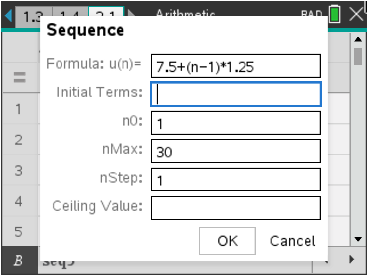 Students will move to page 2.1 and generate a sequence in Column B to display the first 30 terms.