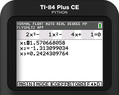 Quickly find roots for polynomials up to the 10th degree, displayed as fractions, decimals, or in complex format for higher-degree equations. Easily store polynomials to Y= to graph and analyze.