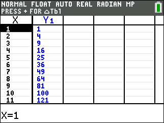 Then, students use the Table feature to explore a table of squares to solve problems. This includes looking at the square and determining the length of a side and looking at the side length and finding the squared value.