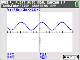 In this activity, students systematically explore the effect of the coefficients on the graphs of sinusoidal functions. Terminology describing the graph—amplitude, period, frequency, phase shift, midline, and vertical offset—is introduced, then reinforced as the student calculates these values directly from the graph using the graphing calculator and the Transformation Graphing App.