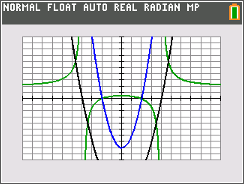 If students graph the functions of the numerator, denominator, and rational function at the same time, they will see that the parabola of the numerator intersect at the rational function’s zeros and the parabola of the denominator intersects at the rational function’s vertical asymptotes.