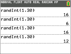 Students will use the random integer command to investigate four types of probability samples. They use the numbers 1 to 30 to represent 30 people and then generate 8 random numbers for a Simple Random Sample.