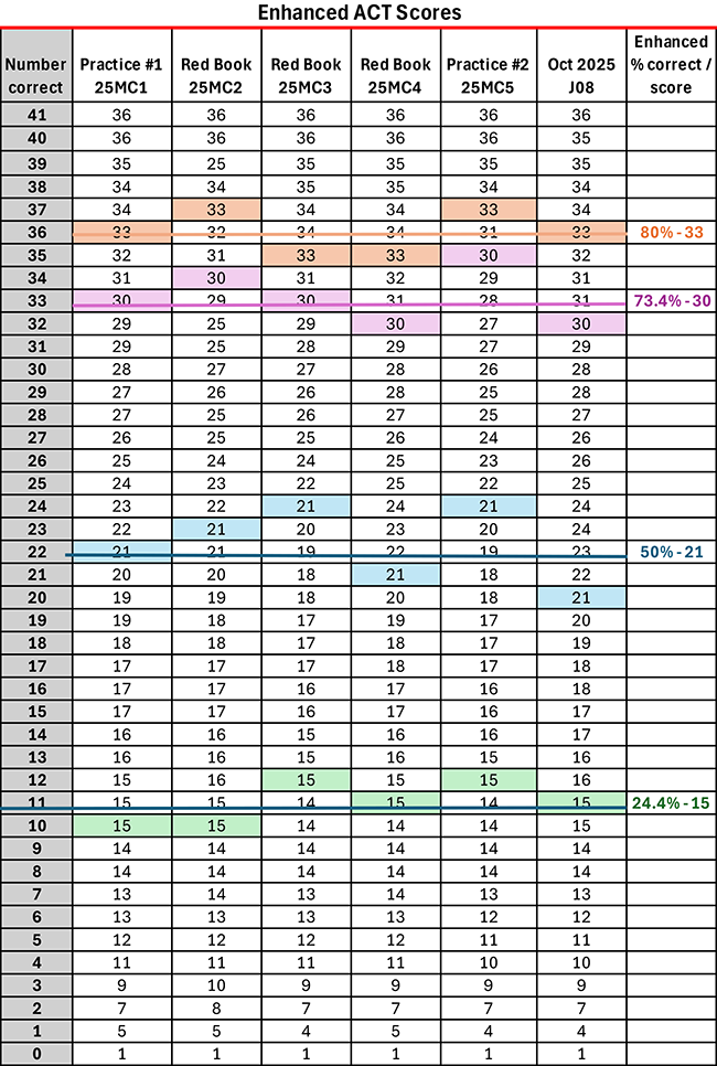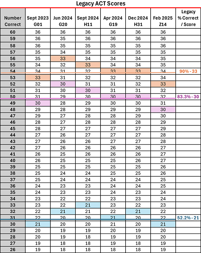 Another observation from the scoring chart is that the February 2025 Enhanced ACT math test is one of the toughest I’ve seen. It’s been a common complaint that the four exams in the Official ACT Prep Guide do not match the difficulty level of the February 2025 exam.