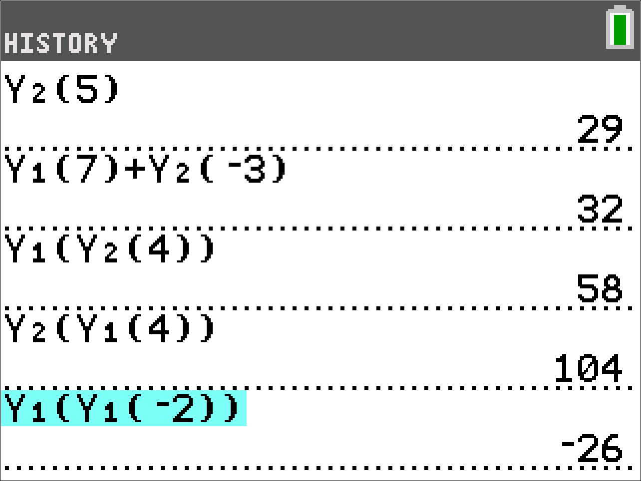You can store the functions in Y₁ and Y₂ to help you answer this question. Press the y= key, then in Y₁ enter in the first function, 3x-2. In Y₂, enter in the second function, x² +4. Then on the home screen, you can use that to do b(a(4)) in this case would be Y₂ (Y₁ (4)). You can find Y₁ and Y₂ by pressing the alpha key and then trace (f4).