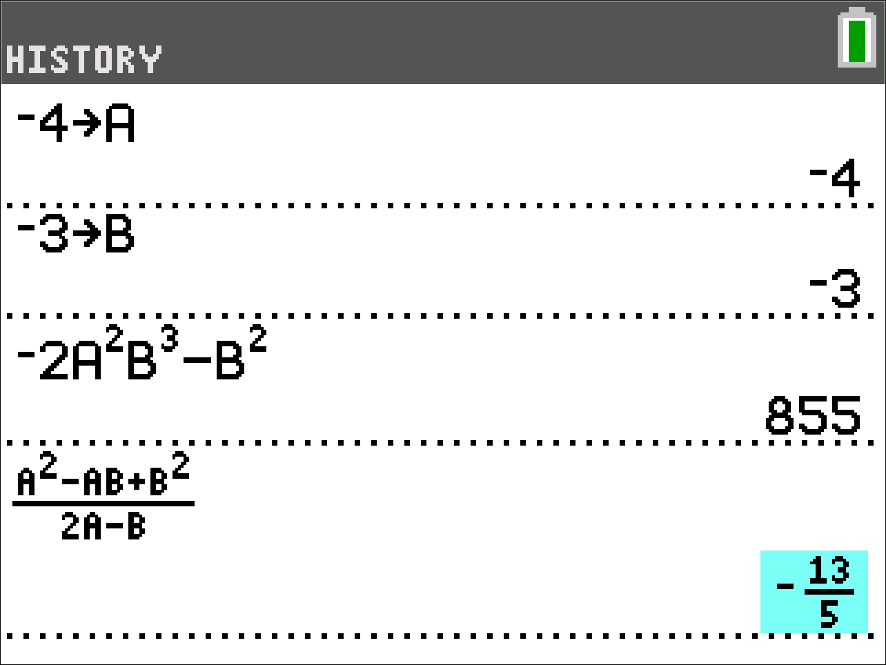 Sometimes you will need to evaluate expressions on the ACT. In the screenshot below, you can see an example on how to evaluate various expressions for A = – 4 and B = – 3. This is possible by using the sto → key on the TI-84 Plus. You can use this feature to assign or store values to a variable.