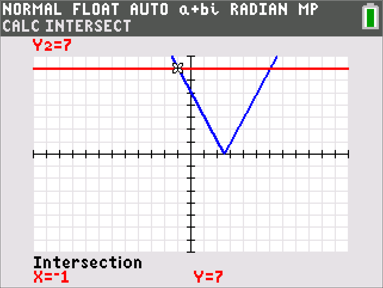 In this problem, you can graph |2x-5| in Y₁ and 7 in Y₂. Once you press the graph button, you’ll see that there are clearly two solutions. One solution is at x = – 1 and the other at x = 6.