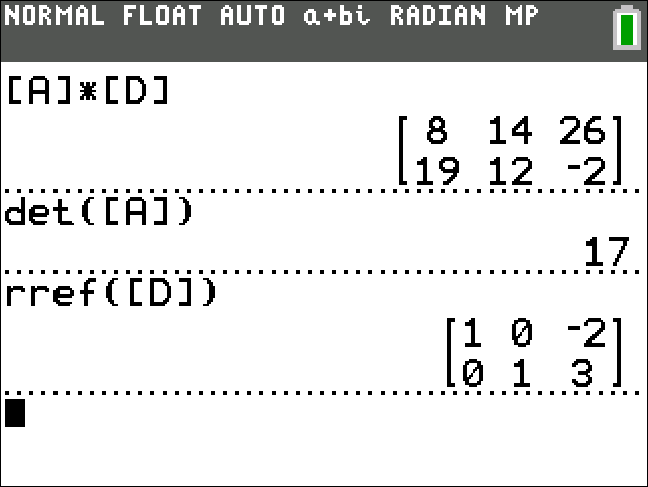 Let’s say that you encounter a problem with the matrices above. You can enter the matrices in the TI-84 Plus by pressing the 2nd key then the x⁻¹ key then arrowing over to EDIT. Once you enter the matrices, you can multiply two matrices together (shown in the screenshot below). You can find the determinant by pressing the 2nd key then the x⁻¹ button, then arrowing over to MATH. To solve systems, you can use the rref (row reduced echelon form) command that is located toward the bottom of the menu.