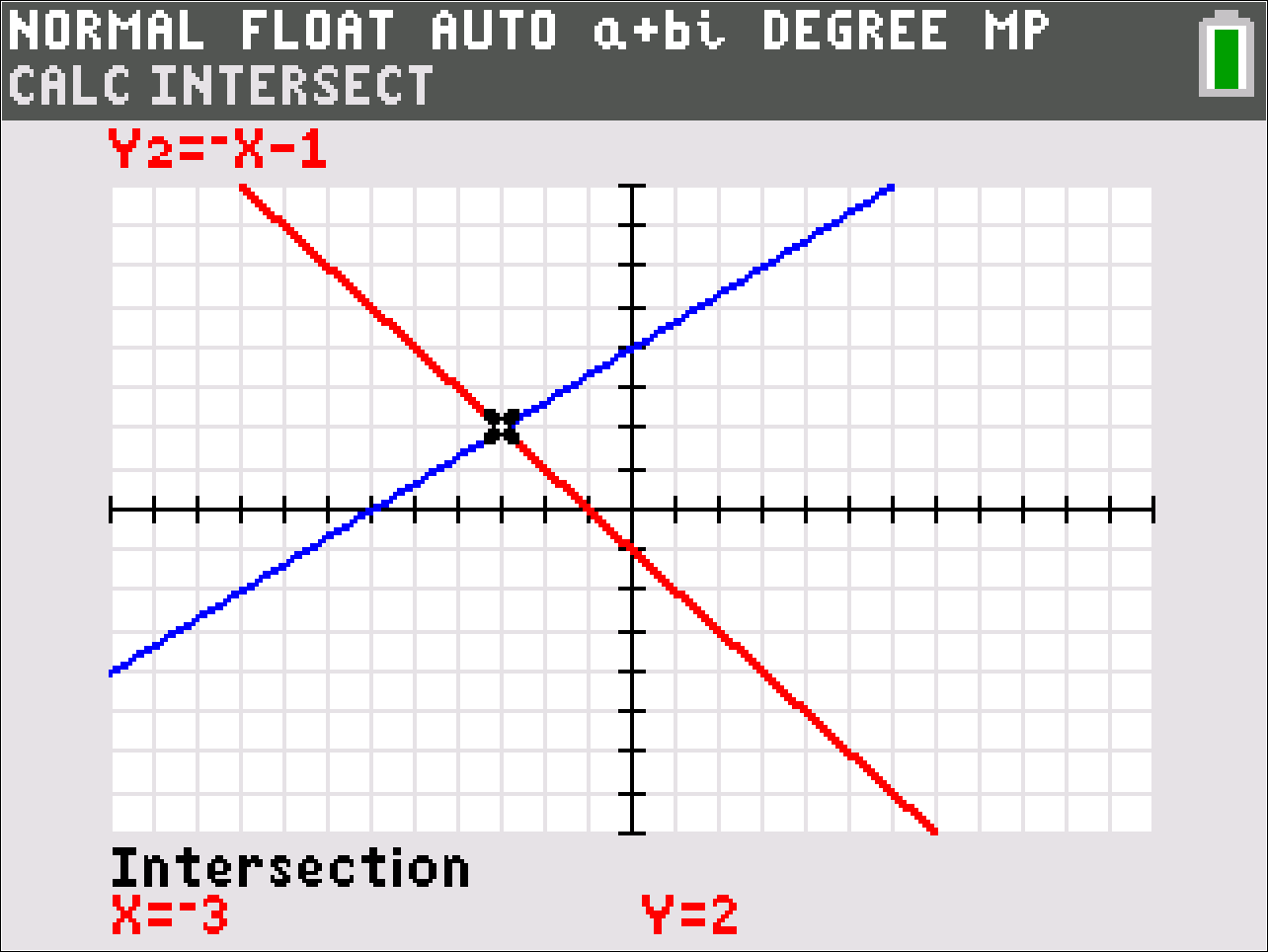 Before you can graph the functions, make sure to solve for y first. After you graph your functions, press the 2nd key and then the trace key and then select intersect to find the intersection point.