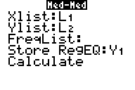 Med-Med (median-median) fits the model equation y=ax+b to the data using the median-median line (resistant line) technique, calculating the summary points x1,y1,x2,y2,x3 and y3. Med-Med displays values for a (Slope) and b (y-intercept).The following example will demonstrate how to calculate a Med-Med regression: