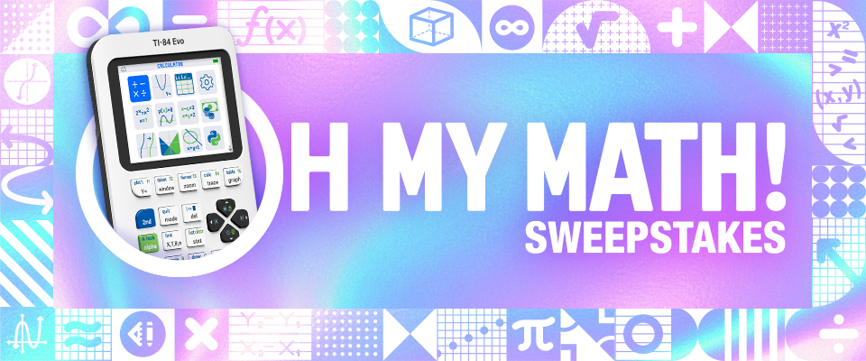 Now, you could be one of the first educators to get your hands on your own TI-84 Evo! Enter the sweepstakes for a chance to win a “Oh My Math” pack: a TI-84 Evo, TI Calculator Plushie keychain in a mystery color and other goodies to help you pick up and GO MATH!