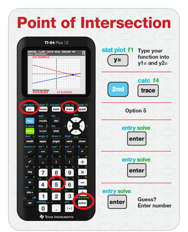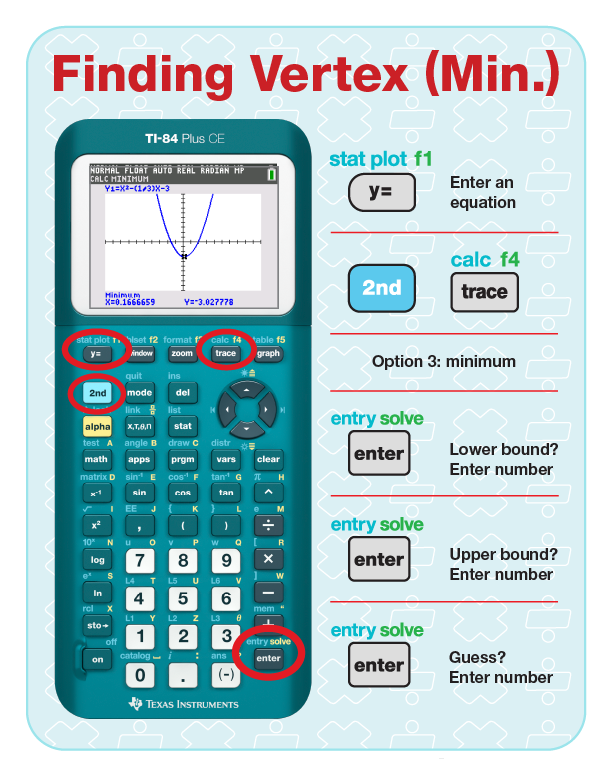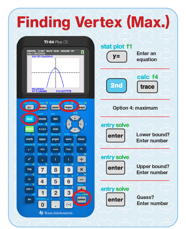 Algebra I and II topics: Absolute value, Adjust table values, Finding vertex (min. and max.), Finding the factors, Typing a fraction, Store a value, Reset calculator, Point of an intersection, and Finding zeros.