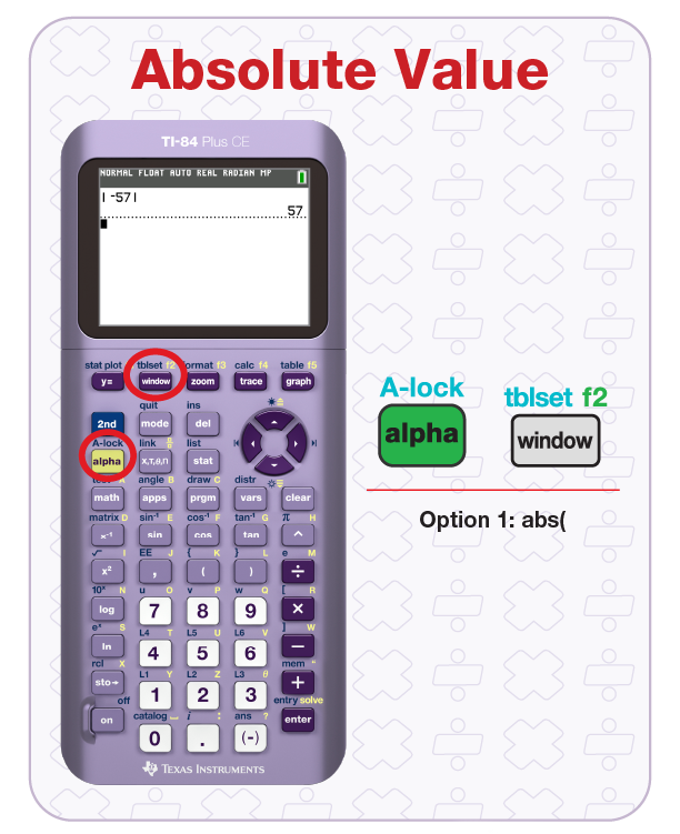 Algebra I and II topics: Absolute Value, Change table settings, Finding vertex (min. and max.), Typing a fraction, Store a value, Point of Intersection, and Finding zeros.