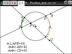• Observe the relationship between the measure of the angle of intersection of two lines and the measures of the intercepted arcs.