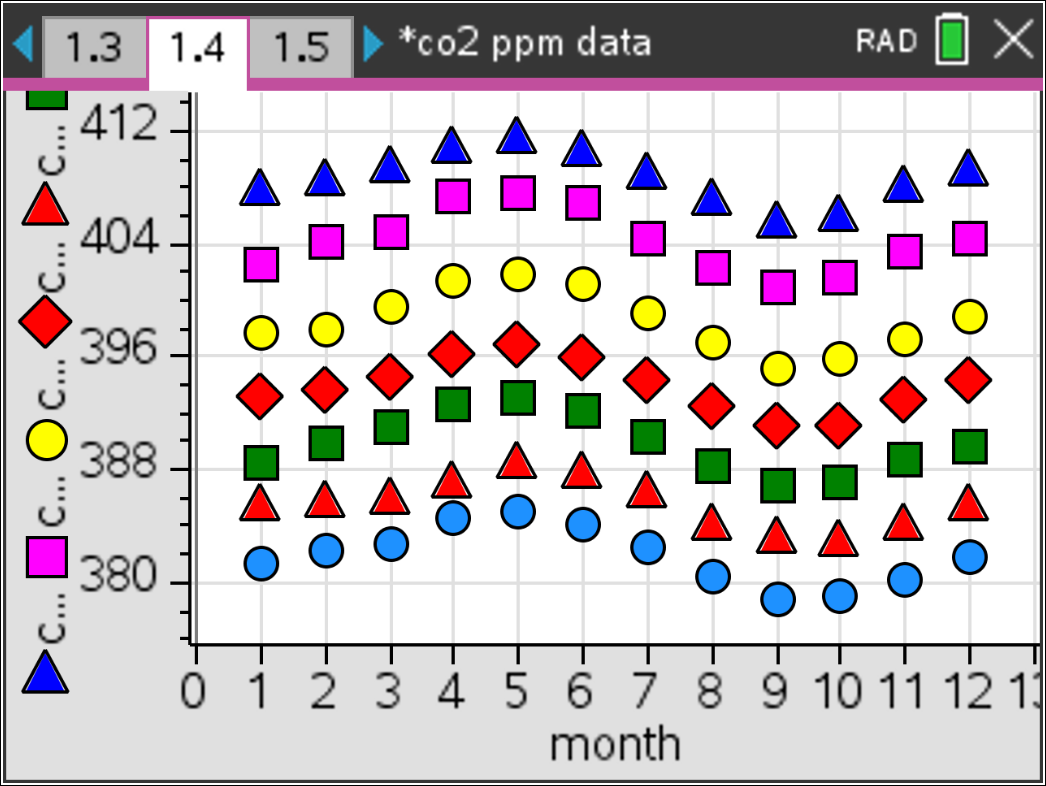 Evident in the data presented in this activity are at least two change patterns: one reflecting cyclic variation across the seasons of the year, and another reflecting an overall general increase in average CO2 levels for each year. This affords a variety of interesting questions the teacher can pose aimed at sorting out these two patterns.
