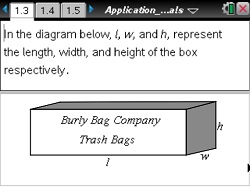 Students use the volume formula to find cubic polynomials in order to determine the dimensions of four different-size boxes used for packaging trash bags.