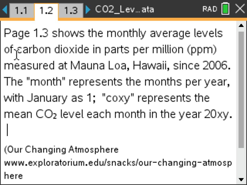 Giving students large data sets can be a challenging and motivating experience. These data are the monthly mean amounts of carbon dioxide in the atmosphere measured in parts per million at Mauna Loa Observatory, Hawaii from 1958 to 2022. The monthly averages are based on daily averages, which are compiled from hourly averages. For more information see NOAA . Note that there is also an introductory activity, Modeling CO2 Levels, that investigates just the data from 2006 using the data in Table 1. This is activity is available in the Prediction section of the Mathematical Modeling activities and could be used as a starting point before examining the trend beginning in 1958.