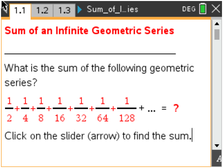 This lesson involves clicking on a slider to see that the area of a square that has been systematically divided into an infinite number of pieces approaches 1.