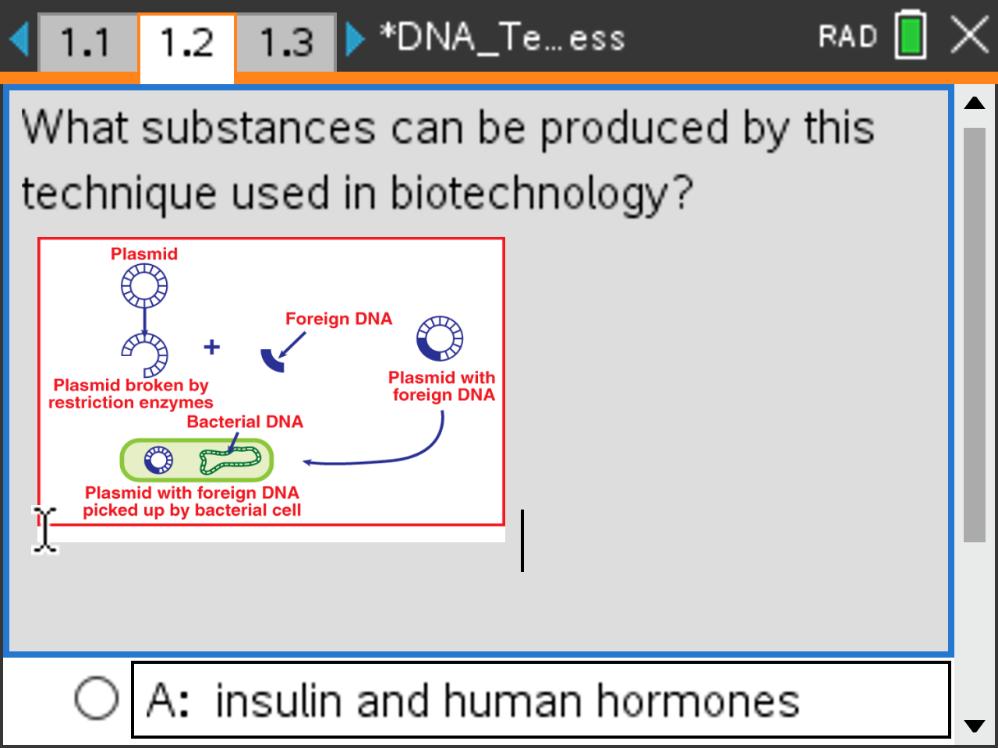 The DNA_Technology_Assess.tns file contains questions associated with activities in this topic, but may contain additional related materials not specifically covered. This file is provided in Exam mode. If you wish to use them as a self-check or review, this property can be changed under Question Properties in the TI-Nspire Teacher software prior to providing the file to students.