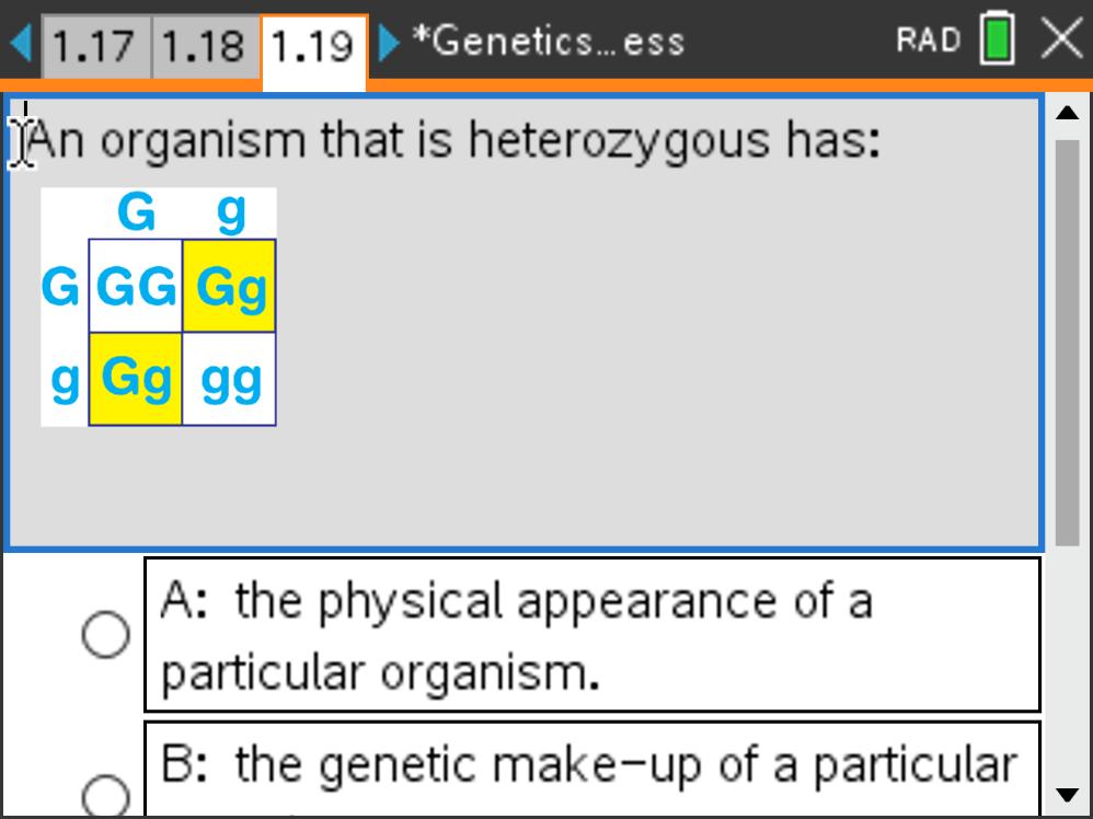 The Genetics_Assess.tns file contains questions associated with activities in this topic, but may contain additional related materials not specifically covered. This file is provided in Exam mode. If you wish to use them as a self-check or review, this property can be changed under Question Properties in the TI-Nspire Teacher software prior to providing the file to students.
