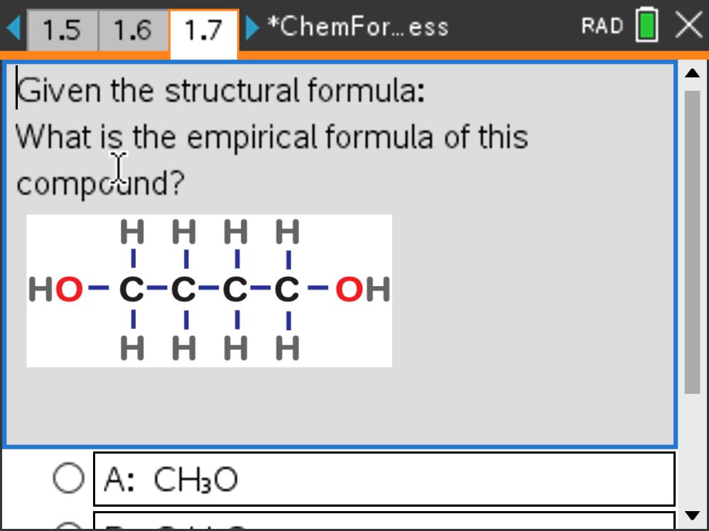 The Formulas_Bonding_Assess.tns file contains questions associated with activities in this topic, but may contain additional related materials not specifically covered. This file is provided in Exam mode. If you wish to use them as a self-check or review, this property can be changed under Question Properties in the TI-Nspire™ Teacher software prior to providing the file to students.