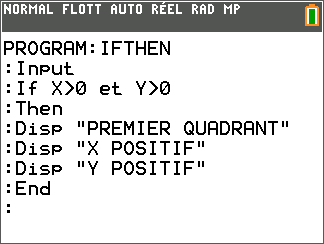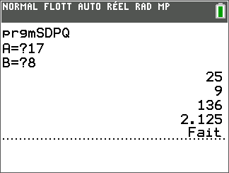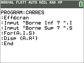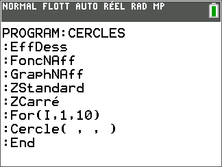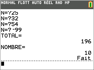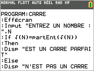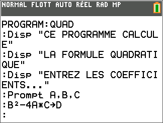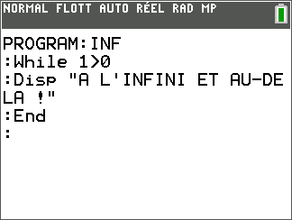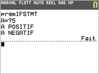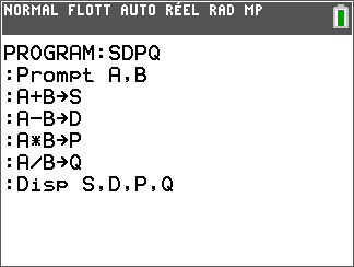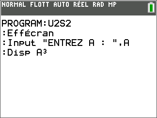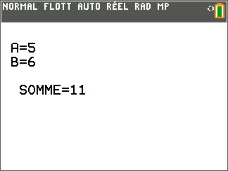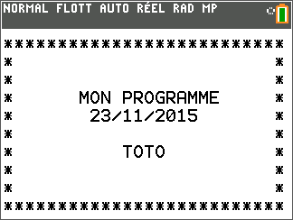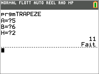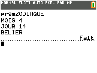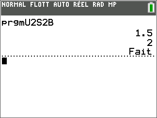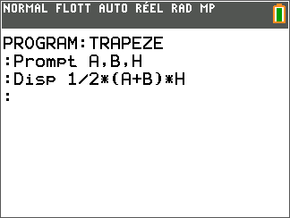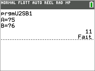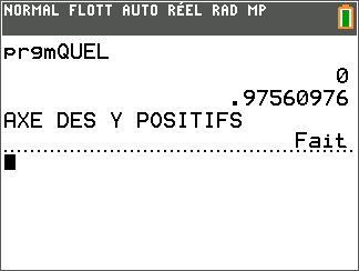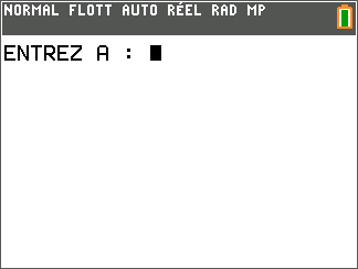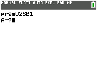 Lançons maintenant l’exécution. Il n’est pas nécessaire de sauvegarder le programme, avec TI-Basic, celui-ci est enregistré au fur et à mesure de sa saisie. C’est pour cela que nous avons nommé le programme en premier.