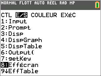 - Appuyez sur [prgm] et utilisez la touche fléchée droite pour sélectionner le menu E/S et sélectionner l’instruction EffÉcran.