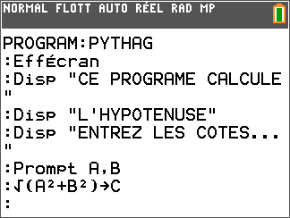 Indication : Certaines des autres touches de la calculatrice se comportent différemment lors de leur utilisation dans l’éditeur de programme : La touche [math] vous permet de sélectionner une des fonctions mathématiques afin de l’utiliser dans un programme. La seconde fonction de la touche [0] ([catalog]) permet d’accéder à la liste de TOUTES les fonctions de la calculatrice classées par ordre alphabétique. La touche [mode] vous permet de sélectionner un mode de réglage afin que le programme change le mode pour ce réglage. Il y a d’autres touches qui présentent des comportements similaires.