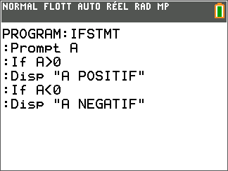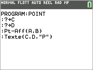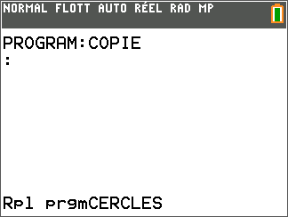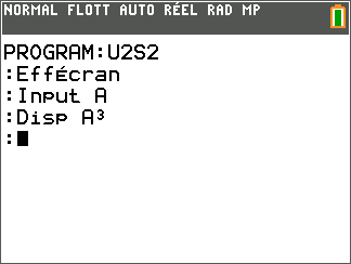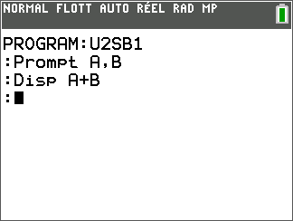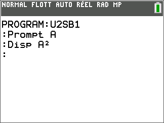 Indication : La modification d’un programme peut se faire à l’aide des touches fléchées, de [suppr] et de [insérer] ([2nde] [suppr]). Le curseur indique l’état actuel du mode d’édition : un bloc clignotant correspond à remplacement ; un tiret bas clignotant correspond à insertion ; et un ‘A’ clignotant au mode alpha.