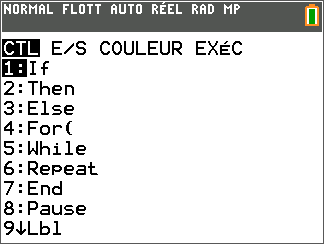La touche [prgm] donne accès maintenant à de nouveaux menus contenant les commandes utilisées en TI-Basic. Si vous voulez utiliser l’une de ces commandes, vous devez la sélectionner dans un de ces menus et non la taper au clavier.