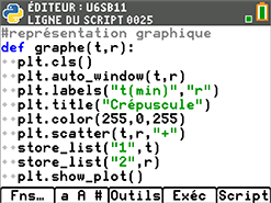 La fonction graphe(t,r) réalise la représentation graphique des données t[ ] et r[ ], puis les exporte vers les listes L1 et L2 de la calculatrice.