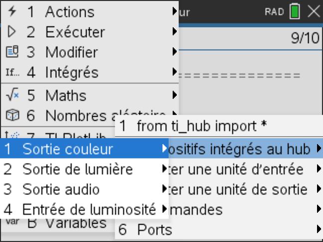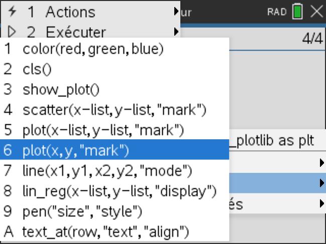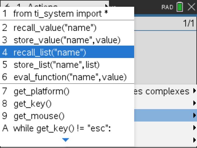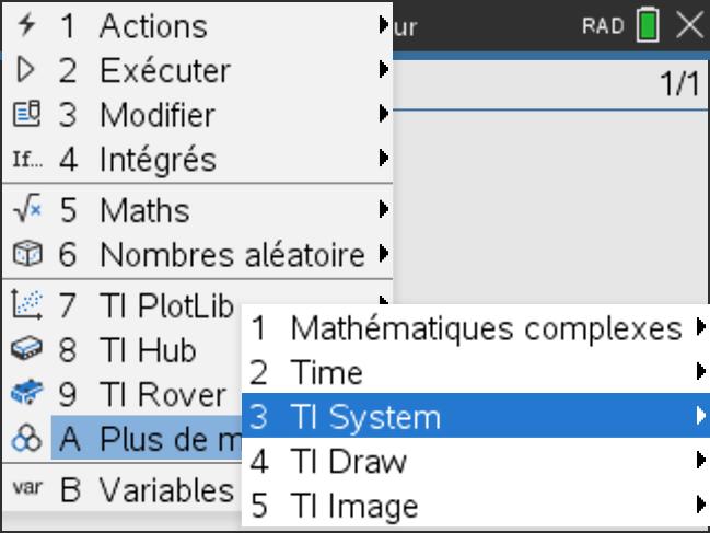 Les rubriques 4 à 9 donnent accès aux bibliothèques intégrées (Maths ; Nombres aléatoires, TI PlotLib etc.).