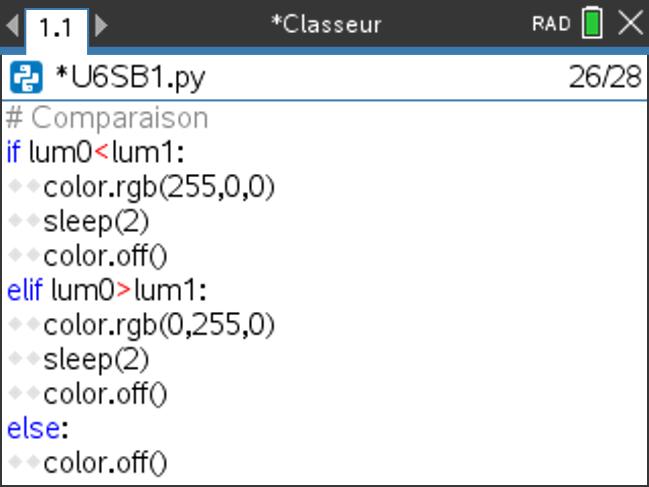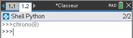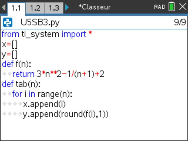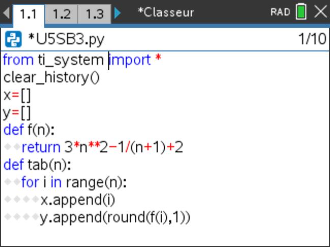 Conseil à l’enseignant : l’utilisation directe du clavier de la calculatrice permet également d’écrire les commandes en Python. La coloration syntaxique s’active automatiquement lorsque les instructions sont écrites sans erreur.
